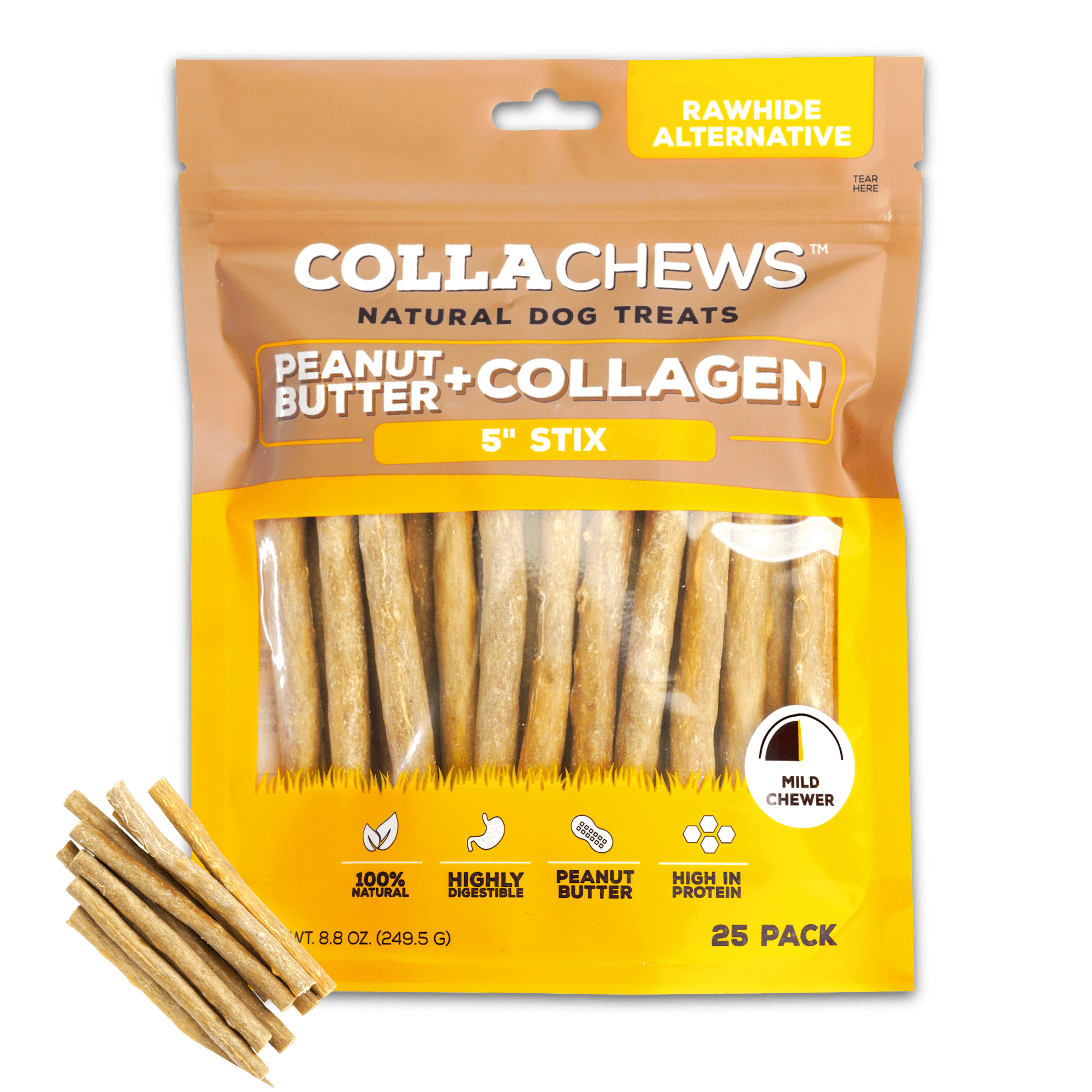 Collachews Peanut Butter Sticks are healthy, all natural, rawhide free alternative dog chews that feature beef + collagen as the #1 ingredient. Made of hydrolyzed collagen peptides, they are an all-natural source of protein, and are highly digestible. They are scientifically-tested to last two times longer than leading rawhide alternatives.