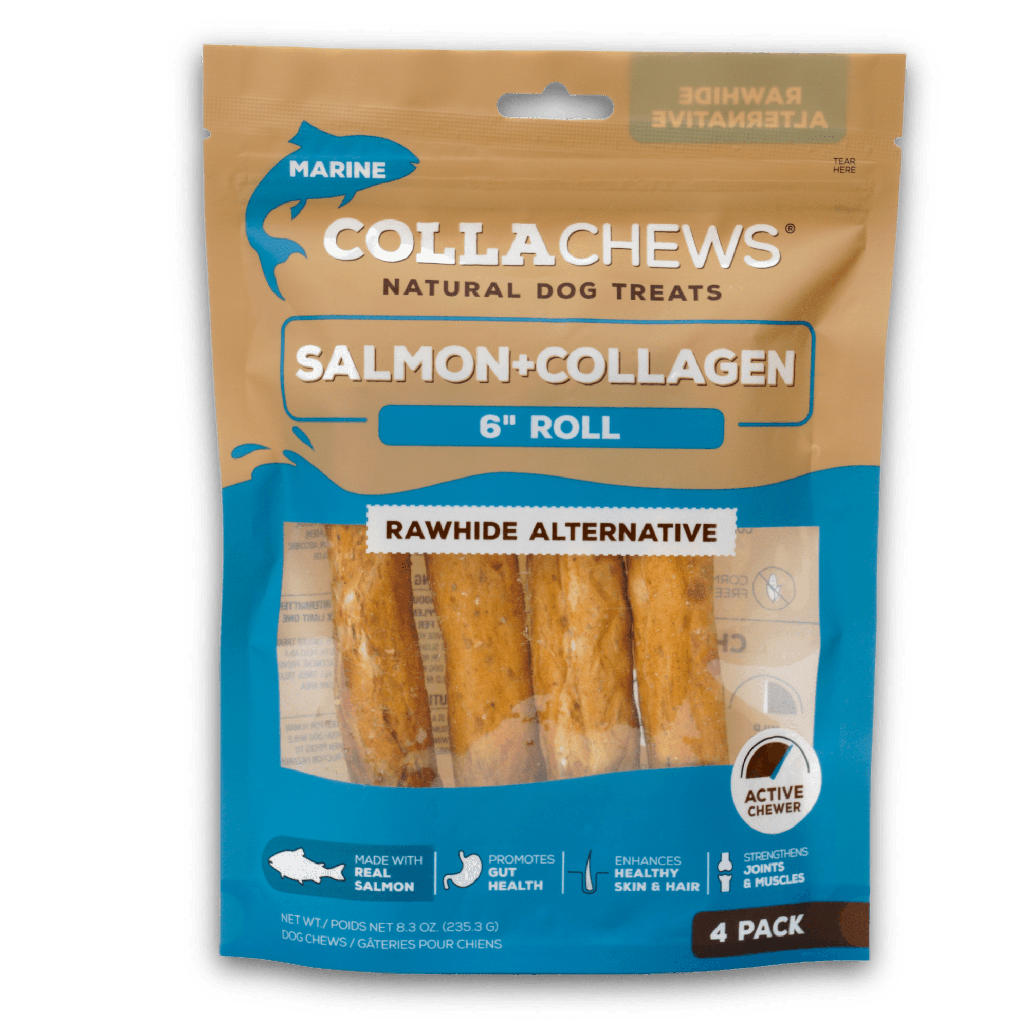 Collachews Salmon Rolls are healthy, all natural, rawhide free alternative dog chews that feature salmon + collagen as the #1