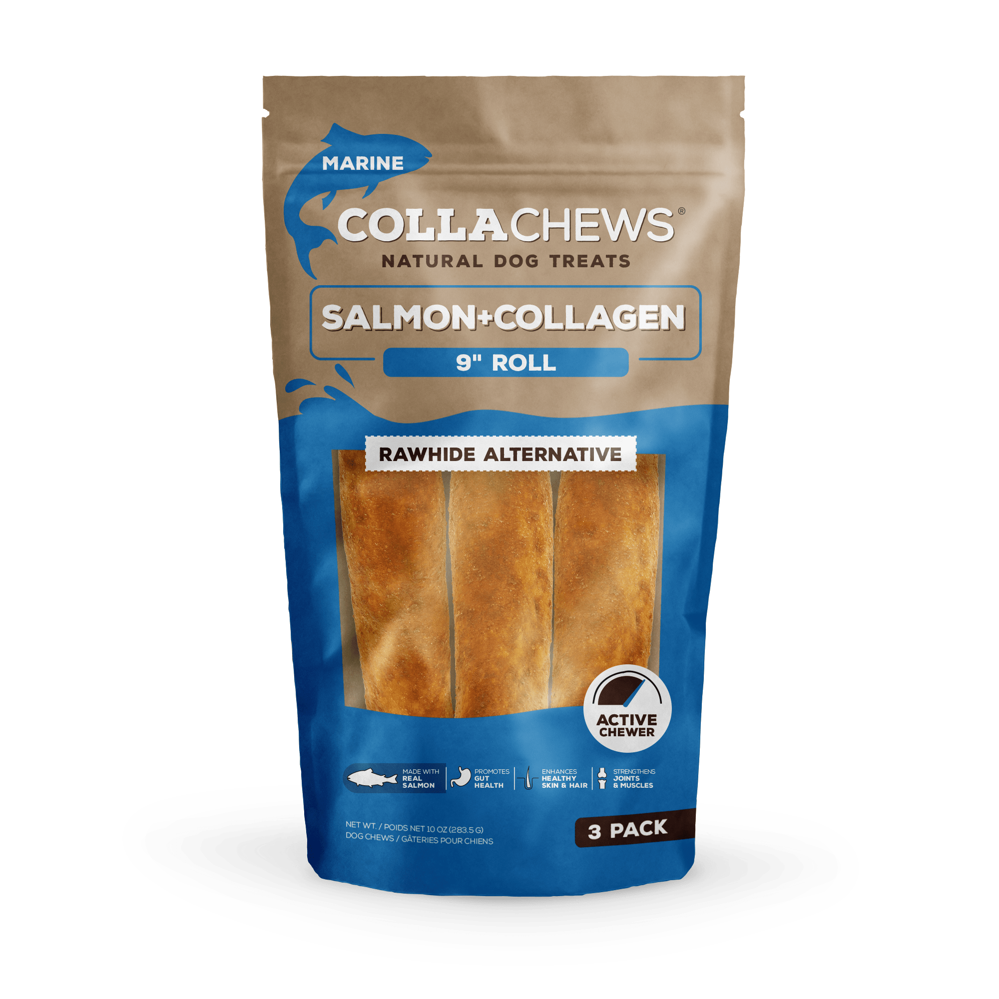 Collachews Salmon Rolls are healthy, all natural, rawhide free alternative dog chews that feature salmon + collagen as the #1