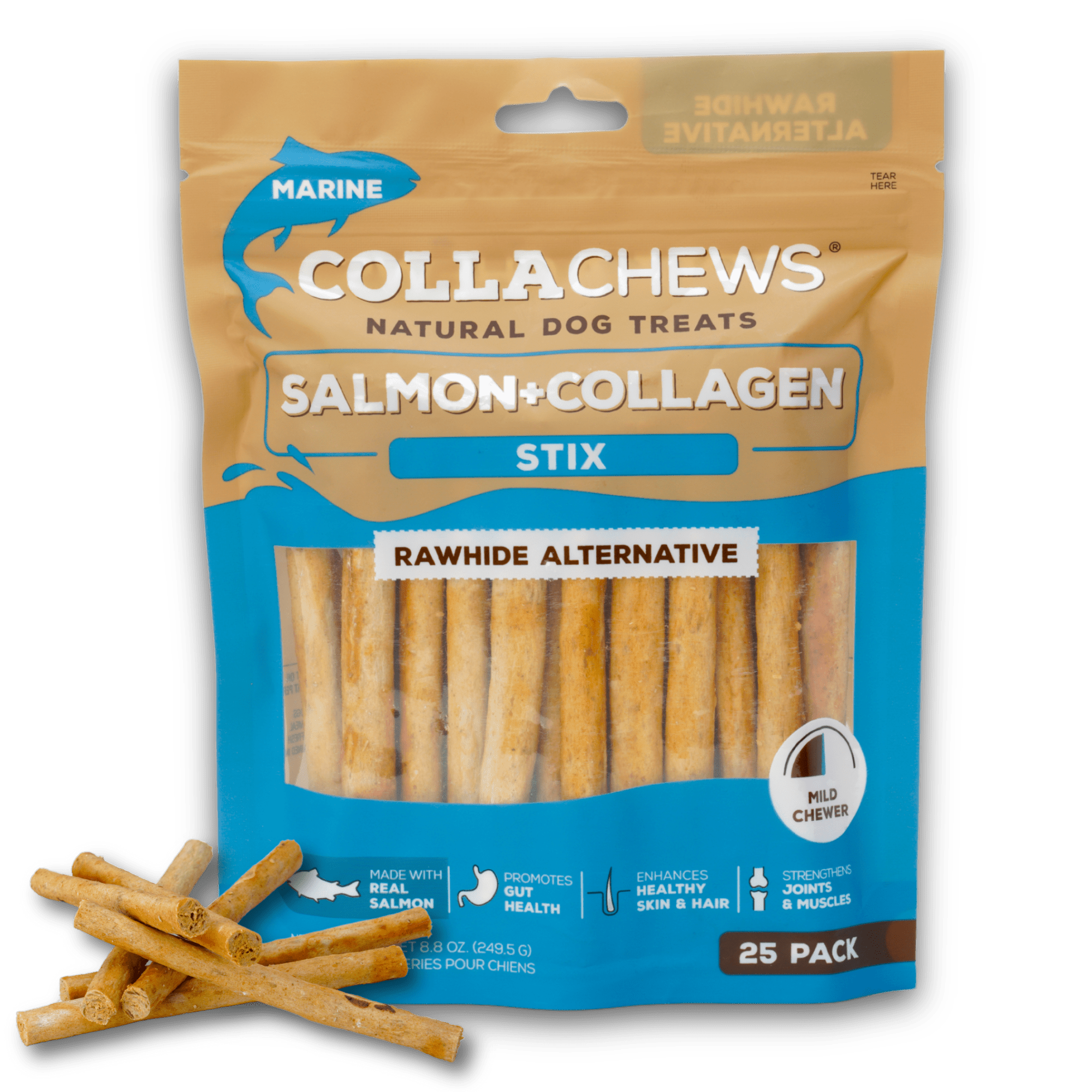 Collachews Salmon Sticks are healthy, all natural, rawhide free alternative dog chews that feature salmon + collagen as the #1